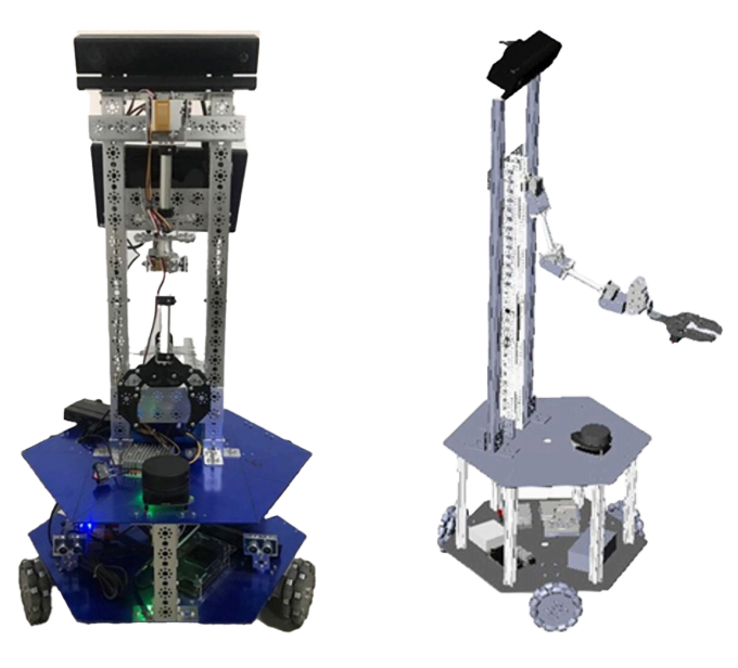 该系统由深度相机、激光雷达、三自由度机械臂等组成,具有全向移动能力。系统通过点云与神经网络算法,能够识别桌面高度,并抓取指定物品。系统支持ROS1与ROS2, 能够进行SLAM建图定位以及自主导航。