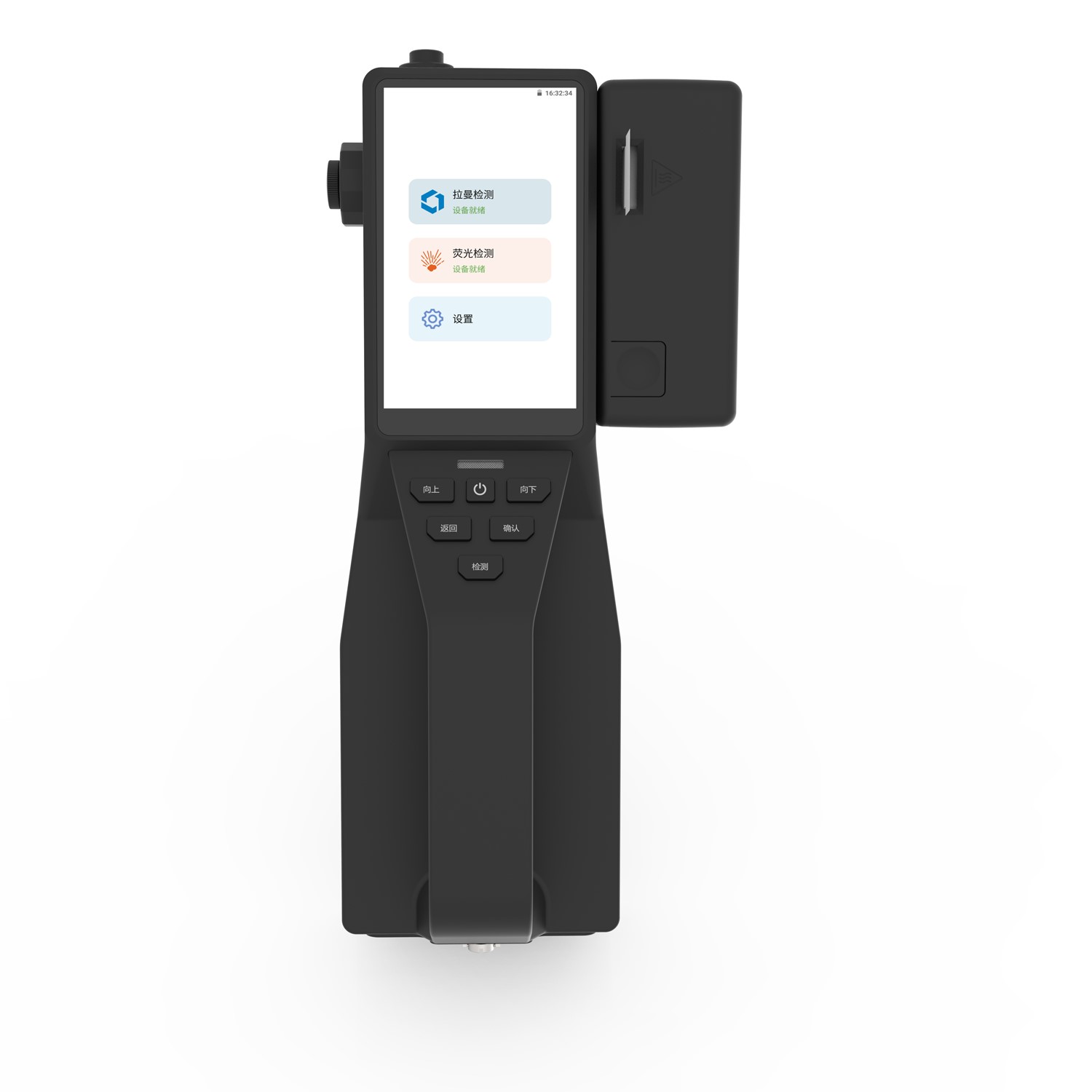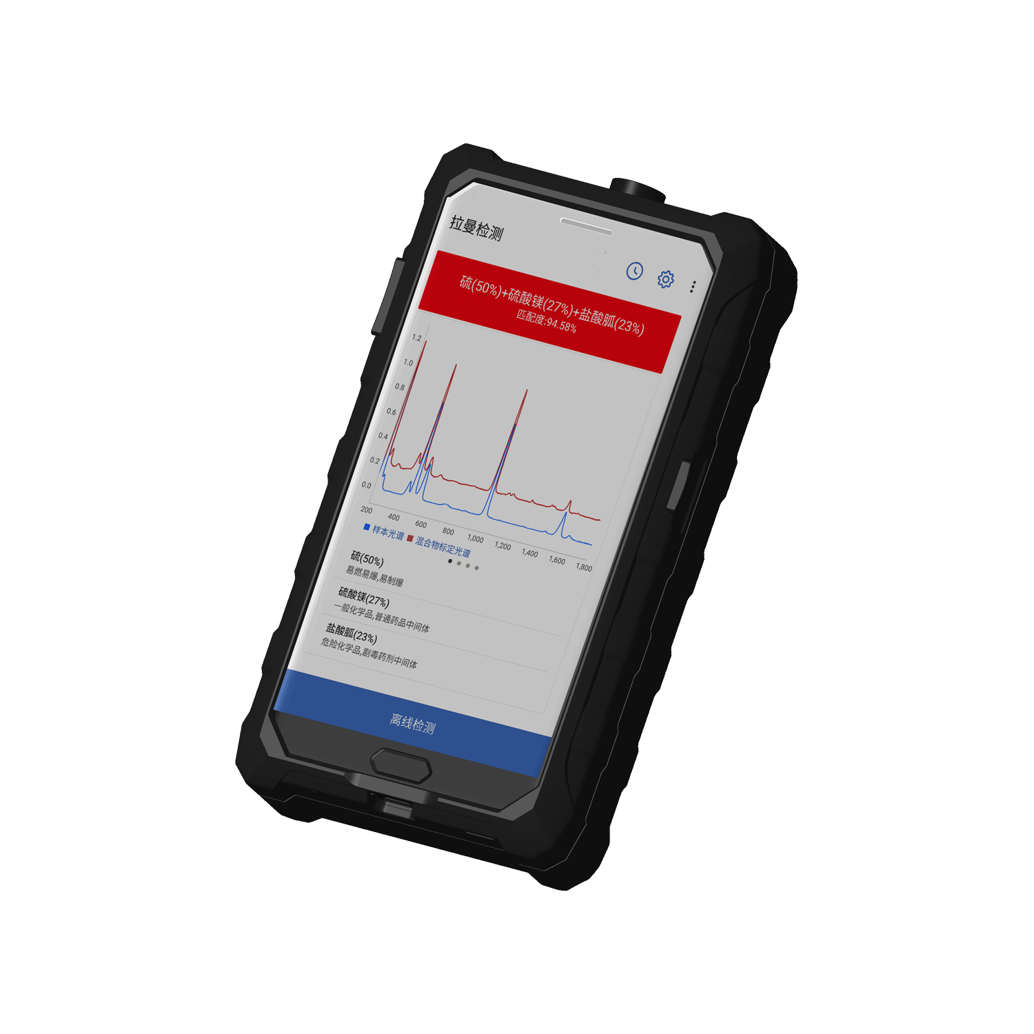手持荧光拉曼复合毒品炸药探测仪,集荧光淬灭和拉曼技术于一体,结合云网端架构,利用荧光淬灭技术实现对可疑人员、可疑物品筛查,如果报警则进行搜查,进一步利用拉曼技术对搜查出的可疑物进行精准定性检测。具有灵敏度高、检测速度快、准确率高、混合物成分比例快速精准分析等优点;结合固液采样帽可以实现毒品及易制毒毒品等微量物质的测量。
